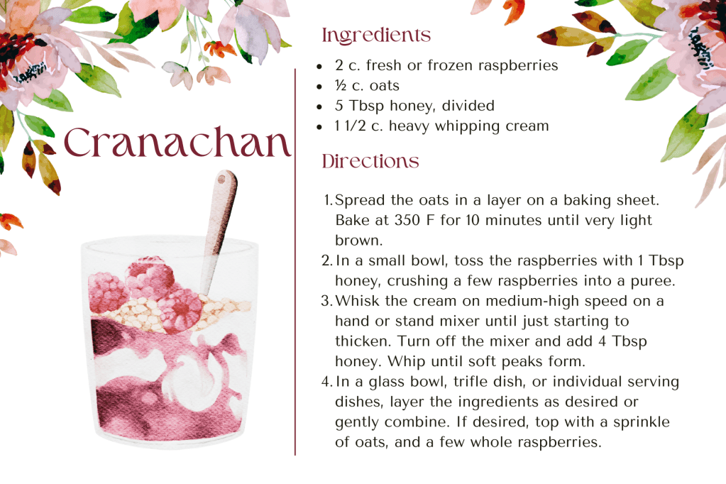 I love to research food in my books, especially from sources from the era I’m writing in. These are two of my favorites. They are both so easy and simply delicious. Serve Cranachan at your Time or Tide book club meeting, or whip up a batch of Petticoat Tails to nibble on while you read Time or Tide!